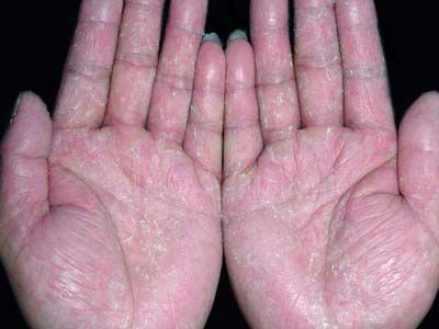 汗疱疹变现为深在性小水疱,粟粒至米粒大小,略高出皮肤表面,常无红晕。对称发生于掌跖及指侧,1-2周后便会干涸成屑,并可反复发生,伴不同程度的灼热及瘙痒,常连续发作数年。