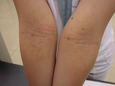 3.特应性皮炎: 初病损多为面颊部,初起时为散发或群集的小红丘疹或红斑,逐渐增多,并可见小水疱、黄白色鳞屑痂皮,可有渗出、糜烂及继发感染。瘙痒剧烈。慢性表现为干性、较大、较隆起的棕红色丘疹和粗糙而带皮屑的棕褐色苔癣样变,可融合成片。经过搔抓,常有少许渗液、表皮剥脱及抓痕。