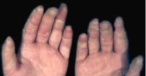 手部湿疹 好发年龄为30~50岁,多为病程较长的慢性顽固性湿疹。易发生于手掌大小鱼际和掌心手背。亦可侵及腕部和手指。手掌皮疹为水泡,脱屑,可合并皲裂,常对称发生,边界多不清楚。手背部湿疹常见水泡、红斑和鳞屑同时存在。