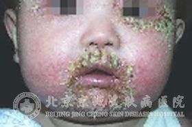 渗出型湿疹:常见于肥胖型婴儿,初起于两颊,发生红斑、丘疹、丘疱疹,常因剧痒搔抓而显露有多量渗液的鲜红糜烂面。严重者可累及整个面部甚至全身。如有继发感染可见脓疱及局部淋巴结肿大、发热。