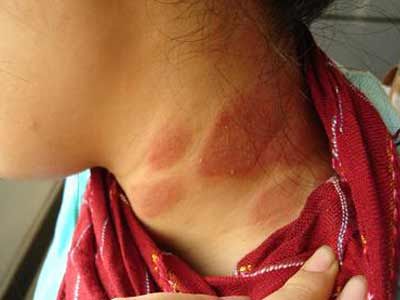 鑫鑫的妈妈昨天发现他总是不由自主的去抓挠颈部,问他怎么回事,说是颈部有瘙痒。鑫鑫的妈妈看了下也没发现啥明显症状,也就没当回事。但等到今天早上给孩子洗脸的时候发现,颈部起来了不少的红疹,看上去像是过敏,但也不确定,所以拨打了北京京城皮肤医院热线。