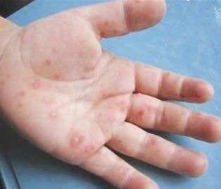 1、宝宝手足口病初期,发热1~2天后手掌,脚掌,以及臀部上同时会长出红色皮疹,一般像米粒或绿豆大小,呈圆形或椭圆形,周围有一圈红晕,没有明显的瘙痒感,以及出现口腔疱疹,多分布在咽喉、扁桃体等处,很快会变成小溃疡。