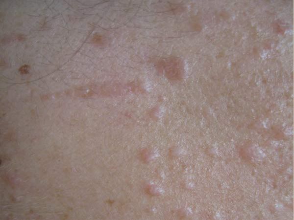 3、 扁平疣在早期时候疣体比较扁平,凹凸得不是很明显,并且疣体表面非常光滑,颜色多为淡褐色,另外,也有不少患者的扁平疣和皮肤正常颜色一样。