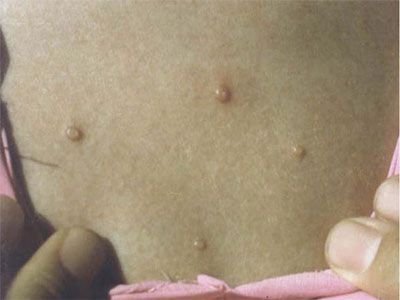 水猴子的皮疹通常可有蜡样的光泽,且中心呈脐凹状,初期的时候质地坚硬,而成熟以后可变软。当把软疣的较先进挑破后就能挤出白色的乳酪状物质,这就是所谓的软疣小体,里面包含有大量的传染性软疣病毒,这也是传染性软疣的典型症状特点。