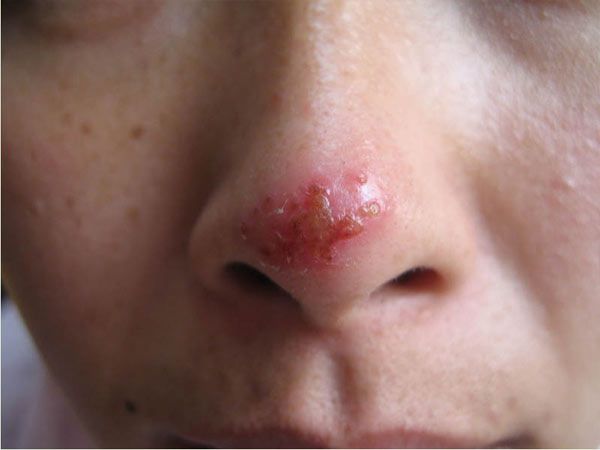 3、单纯疱疹其实常常的多发于类似冬天这样的寒冷的季节。一般就是发生局部性的单纯疱疹,感觉到局部开始有灼痒紧张的感觉,慢慢的就会出现红斑,在红斑或者是正常的皮肤上面就会出现有一些拥挤的小水疱群,并且这些水疱的疱液呈现出清澈透明的状况,后来就会慢慢的变得有些个混浊,不小心擦破之后就会出现糜烂渗液、结痂,也有很大的可能转化为继发化脓感染,这个时候皮肤附近淋巴结可肿大。