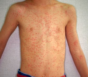 2、出诊阶段:发热3到4天后,就会出现皮疹。较初耳后发际之后面部、颈部也会有,较后就会向躯干和四肢周围扩张,直至到达手心和足心。皮疹初期颜色通常为淡红色的斑丘疹,用手轻轻按压就会褪色,直径大约为2毫米—5毫米,形状大小不定。开始的皮疹较多,少的会融合,相融合后会出现不规则的片状,颜色也会越来越深。这个期间的体温有时会在40度左右,持续的时间长。