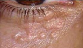 一般情况下汗管瘤多见于眼睑及颊上部近眼周处,发病过程中会出现皮色或淡黄色,表面有蜡样光泽的半球形丘疹,质地更硬,数个或数十个密集分布但不融合。女性(也有部分男性)一般发病率要男性,女性常在妊娠期、月经前期或使用女性激素时皮疹增大。部分患者有家族史,以常染色体显性遗传方式遗传。