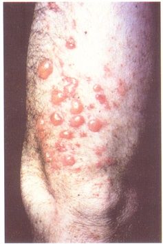 1. 皮损表现为厚壁的水疱及大疱,以多形性的皮疹;