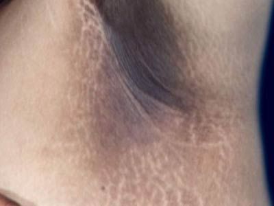 2、恶性型:多发于成年人群,病因不明,危害大,症状为色素较深的丝绒样皮损,可遍布全身,而且还会伴发胃肠癌、乳腺癌等内脏腺癌症,危害很大。