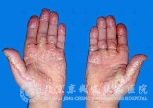 皮疹为工一4mm大小的桔黄色或黄色丘疹构成,好发于手、膝、臀、臂等处,也可发于全身部位。皮疹呈痤疮样外观,迅速分批或骤然发