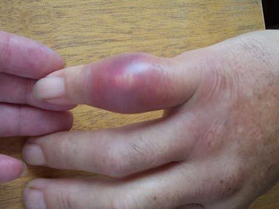 2、急性痛风关节炎:此时期的患者会出现剧痛症状于足弓、脚踝、大脚趾、脚背、膝、腕、手指等易受累关节部位,因此病人常疼痛难当,都无法穿上鞋子,而会穿著拖鞋前来就诊。但若任其发展,渐渐的很可能会对其他多处造成侵犯,如、脚踝、脚跟及肘等关节部位,但不是其它部位就不会发作,此期间应注意诊断的重点。并保持高度的警觉性,切勿以为其它部位的疼痛一定不是由痛风所引起。