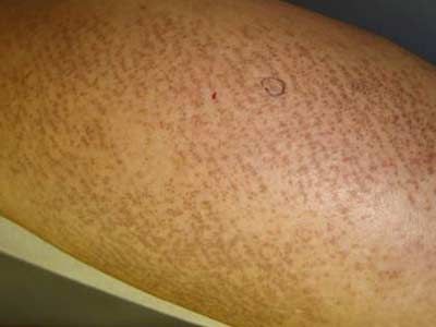 原发皮肤淀粉样变多发生在双胫前、上臂、腰背和大腿处,多为对称分布;常见的症状特点为粟粒样角化性圆顶丘疹,顶部有角质栓,表面粗糙坚实,正常肤色或灰色的皮疹,呈网状或波纹状,但互不融合,具有剧烈的瘙痒感。