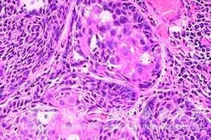 三级鳞癌:肿瘤团块与周围间质界限不清已无角珠形成,仅小团或个别*发生角化,而且很多部位中看不到角化现象。大多数肿瘤出现异型性,核丝分裂很多,而且多为不典型核分裂。
