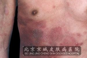 (一)红斑期:皮肤受损多呈单个或扁平斑片,皮肤表层被覆有鳞片,大小不等,通常界限模糊不清,颜色呈暗紫红色不等。自觉剧痒或无明显的症状,偶见皮肤受损消退而不留瘢。