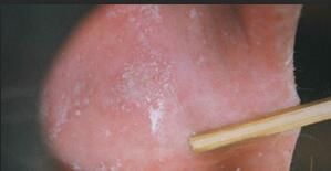 线状扁平苔藓多发生在口腔,尤以颊粘膜、舌、牙龈、唇多见,为树枝状或网状白色细纹或白色雀斑、丘疹、斑块,可伴发水疱、糜烂、溃疡,引起严峻不适。男性龟头粘膜可泛起0.3—0.5cm紫红色环状损害,伴有糜烂、溃疡、痛苦悲伤,女性多见于大小阴唇内侧,也可见于阴道、子宫颈,偶可发生在鼻咽粘膜、眼结膜等。