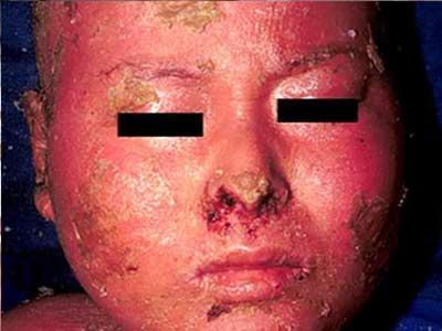 出生时即有皮肤发红,角质样增厚,鳞屑如铠甲状广泛分布于整个身体。鳞屑脱落后,留下湿润面。可有松弛性大疱。四肢屈侧和皱襞部受累较重,如腹股沟、腋窝、腘窝、肘窝等可见灰棕色疣状鳞屑。掌跖呈板样角化,甲和毛发正常。此型鱼鳞病可在颈部及手足背出现局限性线状疣状损害。随年龄增长,症状可逐渐减轻。