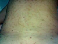 5、1—2周后,躯干和四肢近端出现甲盖大小散在分布的斑疹。