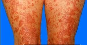 4、头皮、面部发病者常伴有脂溢性皮炎表现,掌、跖部损害常伴角化过度和增厚。症状严重者,皮损可波及全身,也可形成剥脱性红皮病。