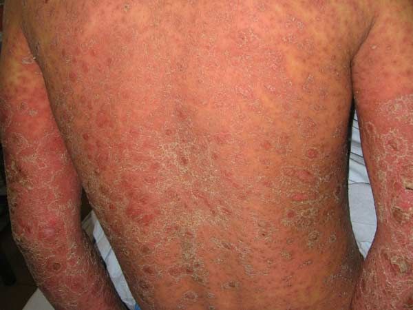 牛皮癣的皮损主要表现为,皮肤上有大块的鳞屑、薄膜以及出血点。皮肤上密布大量的丘疹和水疱,初始状态,丘疹和水疱为针头至红豆大小,随后逐渐扩展,有融合的倾向。其上覆盖许多鳞屑,不断的搔抓的话,可导致鳞屑脱落,患处有破溃的情况。患者的皮肤基底潮红,边缘境界明显。