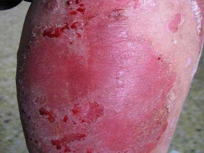 2、皮肤损害为全身性,好发于头皮和四肢伸侧,尤其是肘、膝部位,为红色丘疹、斑块或小脓疱,上覆银白色鳞屑,去除鳞屑及其下面的薄膜,出现点状出血现象。