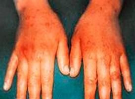 严重者皮损广泛,累及口腔粘膜。有红斑、丘疹、水疱、大疱、糜烂或紫癜。伴有明显内脏病变。前期症状可有畏寒发热、全身不适及咽痛等。皮疹于24小时内发生,对称分布,好发于口鼻周围、手足背、前臂及小腿伸侧,亦可见于躯干。损害为红斑、丘疹、斑丘疹、结节、水疱,重者可出现大疱、血疱或紫癜。常伴有瘙痒、疼痛或烧灼感。口、鼻、眼及外生殖器粘膜可受累,出现红肿、水疱及糜烂。临床上常以一种类型皮损为主,同时兼有其它类型皮损。