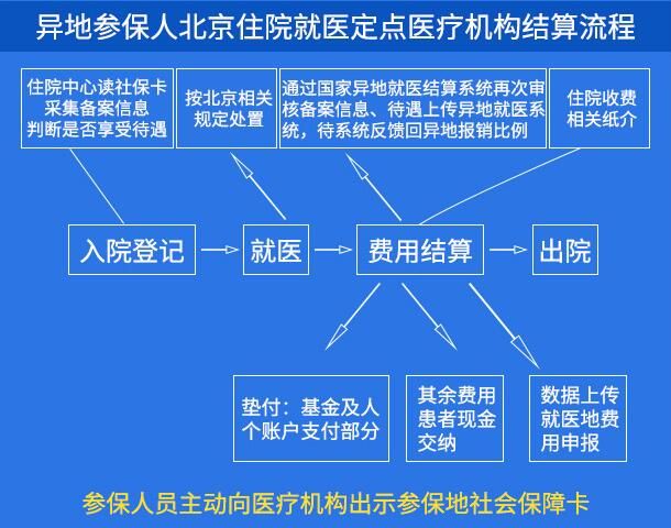 参保人跨省异地住院就医(不含门诊就医)时,只需按照参保地政策规定支付由个人支付的费用,其他费用由就医地定点医院与当地医疗保险经办机构结算。