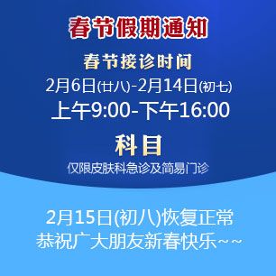 作为三级皮肤病专科医院,北京京城皮肤医院在节假日期间更坚守在疾病防治的较前线,以专业的皮肤病治疗技术帮助患者摆脱疾病困扰,恢复健康生活。为积极做好患者接诊工作,北京京城皮肤医院特安排就诊时间如下: