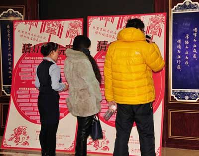 人群中,既有猜出灯谜高兴得手舞足蹈去领奖品的,也有被灯谜难倒冥思苦想或求助“外援”的。猜谜的李大姐高兴地对一位工作人员说:“这个活动办得好,真热闹,给你们点赞!”