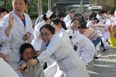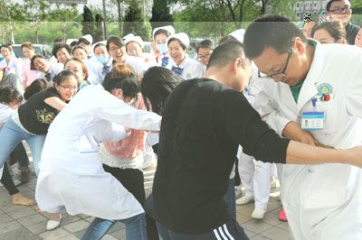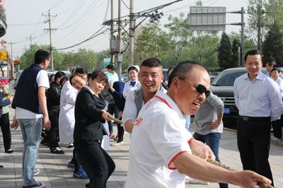 4月21日,北京京城皮肤医院大门口人声鼎沸、热火朝天。医院临床、医技、行政部门、后勤组成的选手聚集在这里,正在进行紧张激烈的拔河比赛。