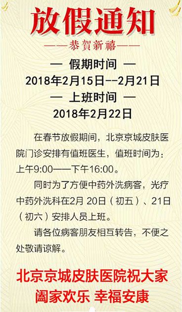 温馨提醒:春节期间要注重健康饮食,避免过多、过杂食物诱发皮肤病,尤其是有皮肤患病史的人群,更要小心防范皮肤病的发作。请各位患者朋友相互转告,不便之处敬请谅解。