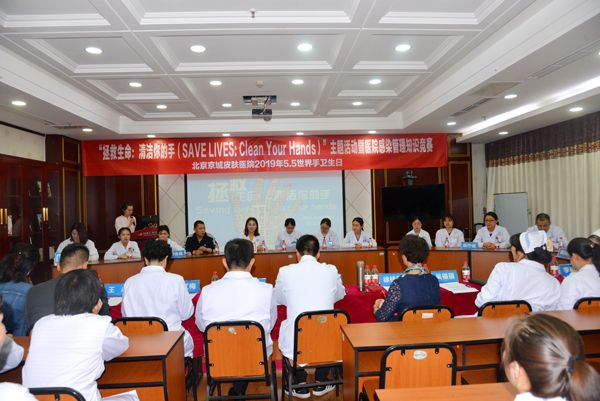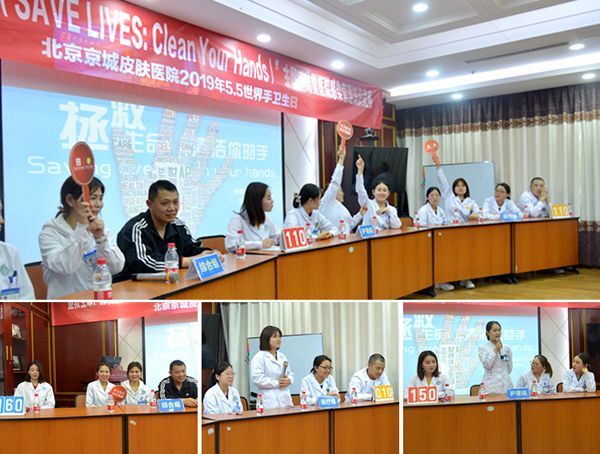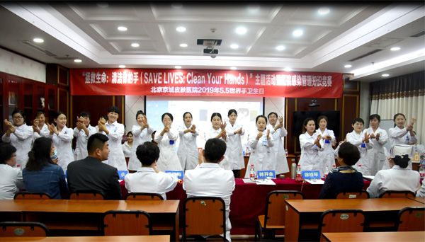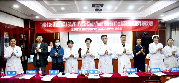 每年的5月5日是“ 手卫生日”。今年的主题为“所有人的清洁护理,就在你的手中 ”。4月29日,北京京城皮肤医院组织感染管理科、医务部、护理部、行政后勤及多个临床科室联合举办了2019年“ 手卫生日”主题宣传活动,进一步增强医护人员的手卫生意识,提高手卫生依从性,切实降低医院医源性感染发生率,并且借手卫生日举办了医院感染管理知识竞赛。亲临活动现场的领导和评委有院长张毅、常务副院长潘红梅、业务副院长林开金、护理院感副院长徐桂琴、医务部尹翠红主任、护理部吴福丽主任、院感刘萍主任、办公室刘新梅主任、后勤王永主任、医生代表周慜主任及护理代表李丽萍护士长。