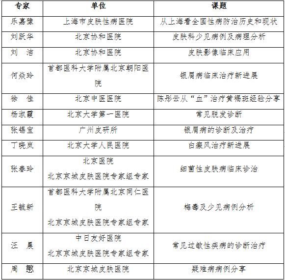 本次大会邀请了多位国内知名皮肤病专家和教授,上海市皮肤性病医院乐嘉豫、北京协和医院刘跃华、北京协和医院刘洁、首都医科大学附属北京朝阳医院何焱玲、北京中医医院徐佳、广州皮研所张锡宝、北京大学第一医院杨淑霞、北京大学人民医院丁晓岚、北京医院张春玲、首都医科大学附属北京同仁医院王毓新、中日友好医院汪晨、北京京城皮肤医院周慜等多位国内知名的皮肤病专家和教授在大会上做专题讲座,同时专家教授们与参会者就皮肤专业高新技术及临床诊疗技术进行广泛的交流和研讨。现将具体事宜公布如下: