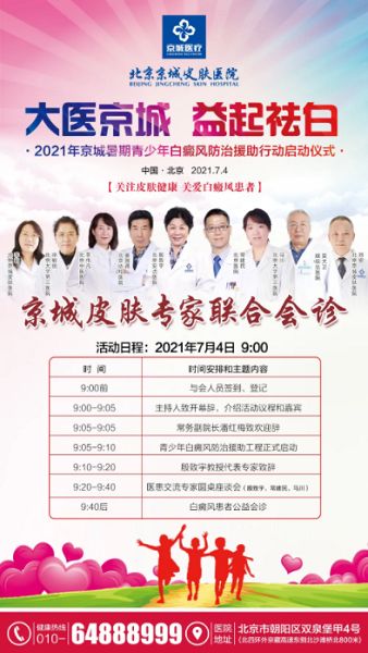 为帮助更多白癜风患者,延续公益爱心精神,我院将开展京城青少年白癜风救助工程活动,特邀请北京安贞医院殷致宇教授、北京医院皮肤科主任常建民、北京大学第三医院马川博士参加”2021年京城暑期青少年白癜风防治援助行动”启动仪式并举办专家公益会诊。