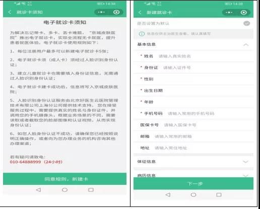 a. 新建就诊卡(同意电子就诊卡须知,输入就诊人信息,点击下一步,人脸识别,完成添加新就诊卡)