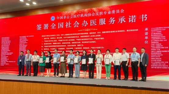 会上,来自全国各地社会办医医疗机构的代表签署了《全国社会办医服务承诺书》,共同承诺促进我国皮肤医学及医疗美容机构的健康有序发展,加强公立医疗机构与社会办医疗机构合作,提高社会办医疗机构皮肤医疗服务水平。