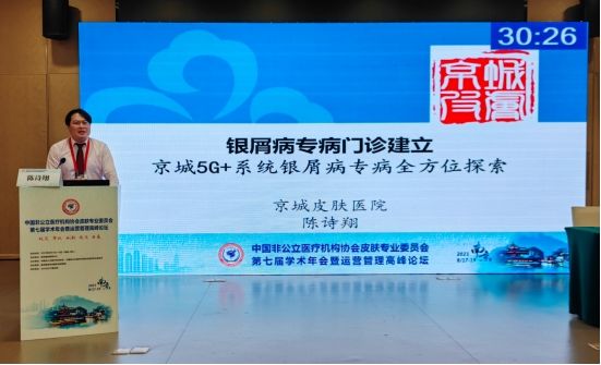 此次年会上,陈诗翔博士代表京城皮肤旗下北京京城皮肤医院作了专题报告,介绍了京城皮肤联合北京大学深圳研究生院等6家单位申报的工信部、卫健委“5G+医疗健康应用试点项目”创新性成果京城5G+智慧银屑病管理系统。该系统实现了银屑病患者院内外一体化健康管理及全病程智慧服务,提高了医疗服务质量和效率,提升了患者就医依从性和健康获得感。这是京城皮肤在“专家、专病、专科、专治”的基础上,对数字化医疗和“互联网+医疗健康”服务新模式的积极探索。