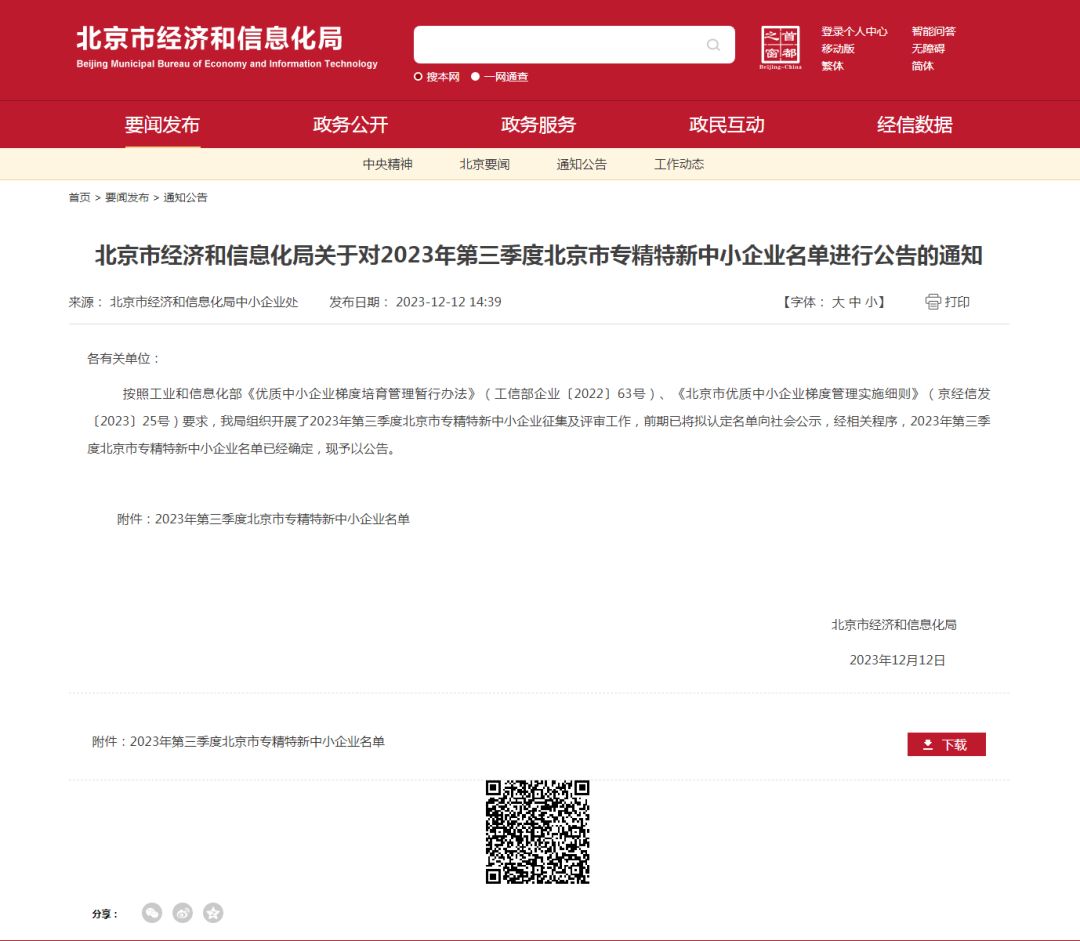 北京市经济和信息化局按照工业和信息化部《优质中小企业梯度培育管理暂行办法》(工信部企业〔2022〕63号)、《北京市优质中小企业梯度管理实施细则》要求,组织开展了2023年第三季度专精特新中小企业征集及评审工作,并于2023年12月5日至2023年12月11日进行了公示。