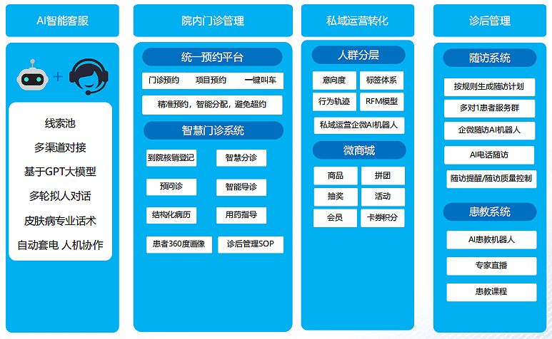 在京城皮肤医院集团及其旗下医院,包括北京京城皮肤医院、河南京城皮肤中医院、唐山京城皮肤医院、徐州京城皮肤医院,AI得到了广泛而深入的应用,涵盖了医学知识问答、智能分诊、排队签到/预问诊、报告查询及AI解读、病历生成及质控、用药指导及辅助诊疗等多个环节。