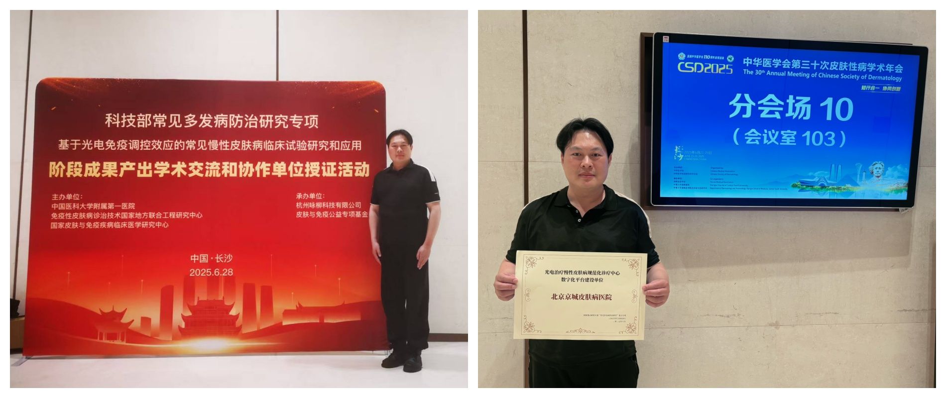 大会期间,我院受邀参与科技部项目「基于光电免疫调控效应的常见慢性皮肤病临床试验研究和应用」第二批签约单位授证仪式。该项目由中国医科大学附属第一医院高兴华教授牵头,该项目的课题「常见皮肤病的网络化队列与数据库建设及技术推广培训」,由北京大学第一医院宋营改教授负责协调,中国医科大学附属第一医院等项目参与单位共同建设。目前项目已构建起 200 余家医疗机构协作网络,并基于睿肤皮肤病病程管理平台,已建设了总量不少于 6 万病例的队列,为慢性皮肤病的研究和防治工作奠定了坚实基础。北京京城皮肤医院荣获“光电治疗慢性皮肤病规划化诊疗中心数字化平台建设单位”,陈诗翔医师现场参与授证仪式,领取队列项目协作单位证书。