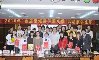 2010年12月22号下午4点,北京京城皮肤医院多功能会议厅欢声如雷,一场主题为“2010年首届京城微笑演讲服务季”活动演讲会比赛在这里隆重举行,对于本次的演讲比赛,医院的各界领导给予了大力的支持和广泛关注,其中吴美先、杨国金、白树新、胡佩瑜、李小英等各个阶层的领导在百忙之中亲临演讲会现场担任评委嘉宾。