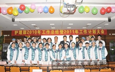 2010年12月23号,北京京城皮肤医院护理部在多功能会议厅,召开护理部2010年工作总结2011年工作计划大会,北京京城皮肤医院院长白树新、杨国先,财务主任于波,程瑞琴、护理部主任刘梅玲等院领导出席了本次会议,面膜室、输液大厅、病房、治疗区、过敏源、中药外洗和手术室的护士长及全体护士共同参与。