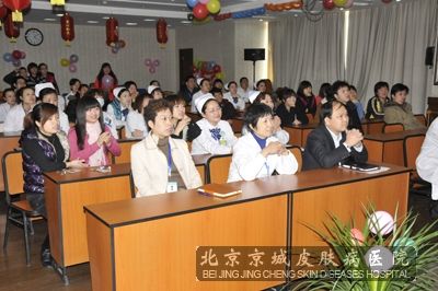 2011年1月11号, 北京京城皮肤医院四楼多功能会议厅成了微笑的海洋,“首届京城微笑服务季活动总结颁奖大会” 在这里隆重举行。经过一系列严格的评比和筛选,较终评选出二十名微笑标兵、十名微笑之星、一名微笑天使和一名特别微笑专家。北京京城皮肤医院杨国金、杨国先院长、白树心院长、企划总监李小英、于波主任、程瑞琴主任等相关领导前来出席本次的颁奖典礼,并且为这些获奖选手颁发了荣誉证书。