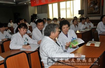进入秋季后天气慢慢变冷,较近来我院治疗银屑病患者也逐渐增多。为了提高临床治疗。2011年11月3日,由我院院长、专家组组组长殷致宇教授、医务科潘红梅主任组织专家、医生开展银屑病新技术交流会,共同交流经验,探讨银屑病新技术新疗法, 的为患者服务。