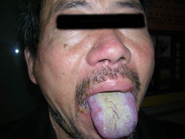 1、口腔损害:主要是疼痛性溃疡,占99 ~100 ,是本病发生较早,发生率较高和反复时间较长的一种损害。常见于舌尖及其侧缘,下或上唇内侧和下或上齿龈以及颊粘膜,而上腭少发生。单发或连续不断地出现,一般为3~5个。开始为可以感觉到的小“结节”,迅即发展成溃疡。米粒至绿豆大小不等,圆形或不规则形,边缘清楚,但不整齐,深浅不一,底部或有淡黄色覆盖物,周围或可见红晕。单个损害约于2周左右愈合。早期约一个月发作一次,病期长者发作间隔时间缩短,呈此起彼伏而连续不断地发作,少长期缓解病例。咽喉发病时,溃疡数目少但较深而大,症状重,愈合慢。