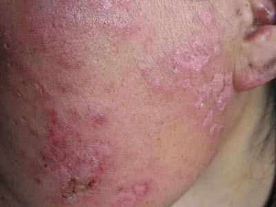 2,初期为水肿性丘疹,逐渐扩展到周围,中枢病变环形红斑消退,周边渗透到轻度水肿性红斑,表面光滑或覆盖着规模小,但没有明显的毛囊口螺栓,往往多形或不规则的形状。愈后无疤痕,或可出现暂时性的色素沉着,或持久性毛细血管扩张及色素脱失。病变主要分布在面部,耳朵,胸部,背部,肩部和背部。