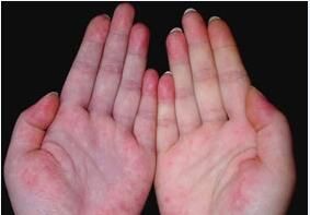 北京京城皮肤医院指出:红斑皮疹是红斑狼疮的表现形式之一。80 以上的红斑狼疮的症状会出现皮肤损害,红斑、皮疹呈现多样型。颧面部蝴蝶状红斑和甲周,指端水肿性红斑为SLE特征表现。蝶形红斑不超过鼻唇沟,而鼻梁、额、耳廓亦可有不规则形红斑。在上臂肘背、掌背、指节、趾节背面、手掌、足底部等部位亦可有不同形状的红斑。形状有盘状红斑、环形红斑、水肿性红斑、多形红斑等。