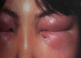 一、皮肤损害通常首先发生在两侧眼皮,两侧上下眼皮变成紫红色,呈实质性水肿,但是眼列大小正常,睁眼不受影响。