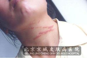 皮损一般会在早上起床后发现,皮损以面、颈、胸背及四肢暴露部位为主,表现为线状、斑片状或点状的水肿性红斑,其上分布密集排列的污黄色、白色的水疱或脓疱,线状皮损跟竹签或指甲刮伤一样,形态多异而不规则。斑片状皮损与皮肤烧伤相似,皮损的长短、大小不一。病程一般为一周左右,皮损干燥,结痂,脱落而愈。局部可暂时遗留色素沉着斑。