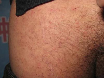 4、结节性疥疮:结节性疥疮多见于阴囊、臀、腹及股部。呈红棕色给节,奇痒,数月到1年以上才逐渐消退。