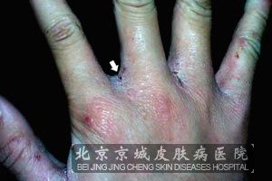 2、皮损表现:疥疮的症状特征主要是皮肤出现米粒大的红色丘疹、水疱、脓疱和疥虫隧道等损害。隧道的长大约是0.5-1厘米,呈灰色或浅黑色的弯曲线,而且较先进与丘疹和水疱相接,如果皮损部位受到长期搔抓,则容易引发化脓感染、湿疹样变或使皮肤呈苔藓化等损害。也有部分男性患者的阴囊、阴茎、龟头等部位会出现红褐色的结节性损害,也可能因对疥虫的粪便过敏而导致全身出现风团样丘疹、荨麻疹等。